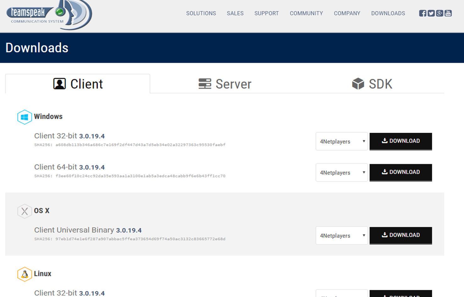 Teamspeak3の設定をするにはasustorから出来なく、Teamspeakクライアントが必要になります。公式ページよりダウンロードしましょう。